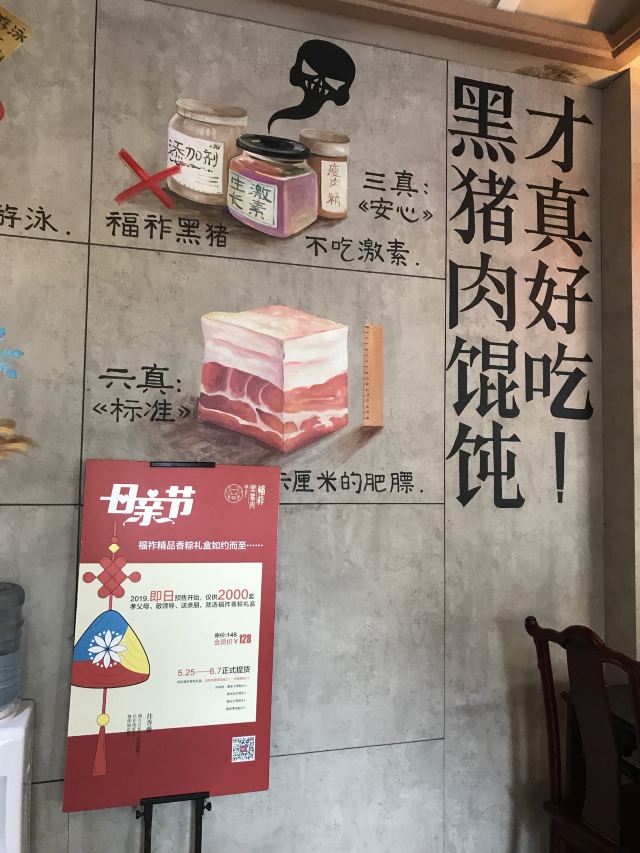 福祚黑猪肉是烟台当地一个响亮的品牌,福祚馄饨就是用黑猪肉为原料加工而成的。口味很好,尽管价格小贵,但还是被广大市民喜爱和认可,目前在烟台已有多家连锁店。