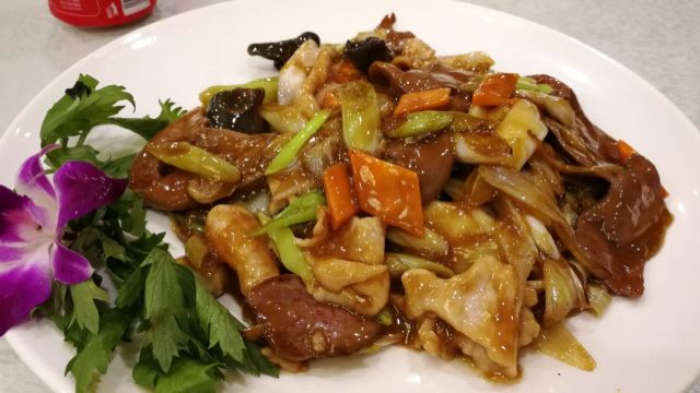 PENG LAI CHUN说真的,胃口小的人不要来着,1-2人吃饭不要来着,为啥?量大品种多,人少吃不了几样,干着急。我们就2人,精选了半天,点了两碗面和一份热炒。 1️⃣全家福 用料丰富,口味浓厚,鲜香丰盛,是鲁菜传统筵席中之的大菜,因为多种原料聚于一盘,所以取名为“全家福”。和天津的八珍豆腐有一拼。 这一大盘里面有蹄筋、虾仁、木耳、玉兰片、鹌鹑蛋、鸡块、冬菇,非常丰富。这道菜分小份和大份,只差8元钱。美中不足的是,蹄筋炸过,吃起来失去了劲道。 2️⃣面食 到蓬莱春一定要吃的福山拉面!福山拉面又叫福山大面,距今已经有二、三百年的历史了,是中国几大著名面条之一,可以配的面卤多达十几种,要想吃全了,估计顿顿吃也要好几天吧。