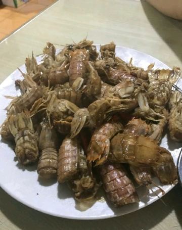 大虾,开边蒸大虾,辣炒牛牛,炒花蛤,海米拌黄瓜,烤鱿鱼头,拌海带丝,烤针鱼,清蒸海蛎子,拌花生豆,三鲜汤
