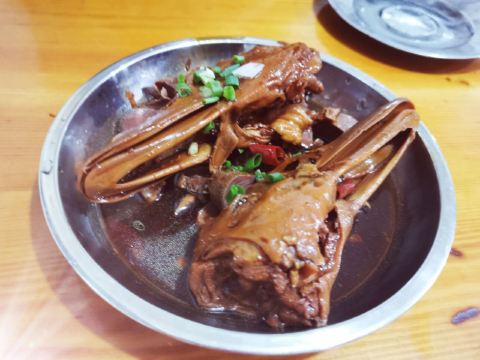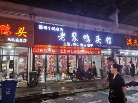 老裴鸭头,马站底92-6。 [薄荷]环境: 衢州闹市区,老街角深藏市井美味。老裴鸭头,是酒店前台小姐姐推荐的。弯弯绕绕,终于找到这家深藏的老字号。闪亮亮的门面,几乎没有什么装修。深夜的大排档,油腻,简陋,朴素,座无虚席,食客们高谈阔论,说话必须靠吼。这才是最真实的衢州夜景头。泼辣,是衢州的个性。辣,是衢州美食的精华。 [服务铃]服务: 老裴亲自坐镇,热情好客,风趣幽默,衢州人一贯的爽朗个性。 |鸭胗^|酱香鸭头^|炒粉干^新鲜出炉的,趁热吃,酱香浓郁,鲜嫩多汁。不过衢州的“微辣”,是杭州人眼里的“辣”。味道虽好,不要贪吃呀。 老裴鸭头,辣辣辣,衢州的精华。