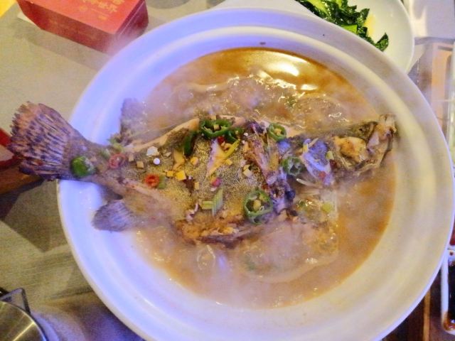 一家三口两大一小,点了半只烤鸭、海鲜全家福羹、一斤二两的红烧桂鱼、青菜共四个菜,还点了两个小碗的牛肉汤和一扎红枣汁,共计628元,味道感觉和我们江浙口味差不多的。