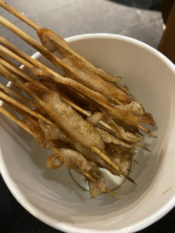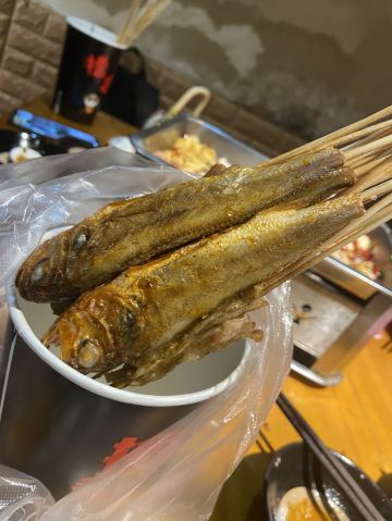 在系马桩吃了烤鱼、刚好发现这家店是邻居开的、打包点回家继续吃、难得吃个夜宵啊 听说鱼不错、弄了点品尝、选的不辣的、肉串是有辣椒的、味道很好啊 还是要选择微辣的。