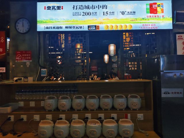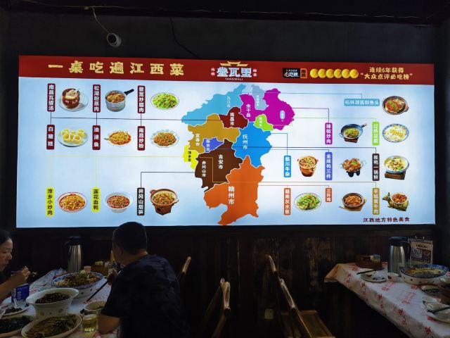 蓝海清风1号店名:堂瓦里(建德观店) 地址:东湖区建德观街149号 营业时间: 中午11:00-15:00,晚17:00-21:30 这是一家南昌本土连锁餐厅,主要做的就是赣州菜,在南昌是有一定知名度的。 本次品尝菜品主要包括: 豆葱炖鱼头、临川牛杂、馋嘴蛙、橄榄菜四季豆、手工银丝卷、CC米酒、拍黄瓜。 【口味】 豆葱炖鱼头 汤汁喝起来很鲜美,适合泡饭,鱼头及半块鱼身吃起来偏清谈,但也咸中有味。 临川牛杂 牛杂有嚼劲,入味,我很喜欢吃。 馋嘴蛙 牛蛙肉质鲜嫩,偏辣但很好吃,吃起来很爽口,和牛杂一样是我爱吃的。 CC米酒 很好喝,甜甜香香的,我把当饮料品尝,一口气连倒几杯就喝完了。 另外几样菜品体验感不强,没怎么吃或打包了。 手工银丝卷 我吃了一个,有点像馒头,我比较喜欢吃带馅的包子。 拍黄瓜 口感清脆,开胃小菜,感觉还行。 橄榄菜四季豆 因为我不太喜欢吃猪油渣,就没怎么吃。 【环境】 这家店距景区滕王阁比较近,位置还是不错的。店里虽然就一层楼门面但空间很大,设有大厅卡座也设有包间。 大厅能看到店里的电饭煲、堂瓦里语录、江西菜地图、点菜谱,也是可以拍拍照的。 【服务】 店员会过来关心就餐体验,帮忙点火。 【性价比】 江西本地菜品很多,价格实惠,总体性价比高,值得推荐。