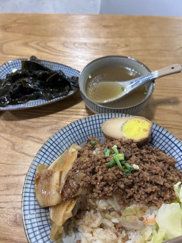 旅游度假位于华联银泰三楼的眷村卤肉饭,店面并不大,旁边是夸父烤串。 团购了一份经典单人餐,要了招牌卤肉饭,另外要了海带。现做等了一段时间,上菜时惊喜发现老板娘还送了一碗汤(老板娘说是牛肉熬的)。 卤肉饭分量十足,微咸搅拌米饭以后味道刚刚好,还有萝卜和半个卤蛋。海带也不错。虽然是清汤但是很鲜。