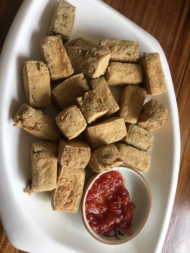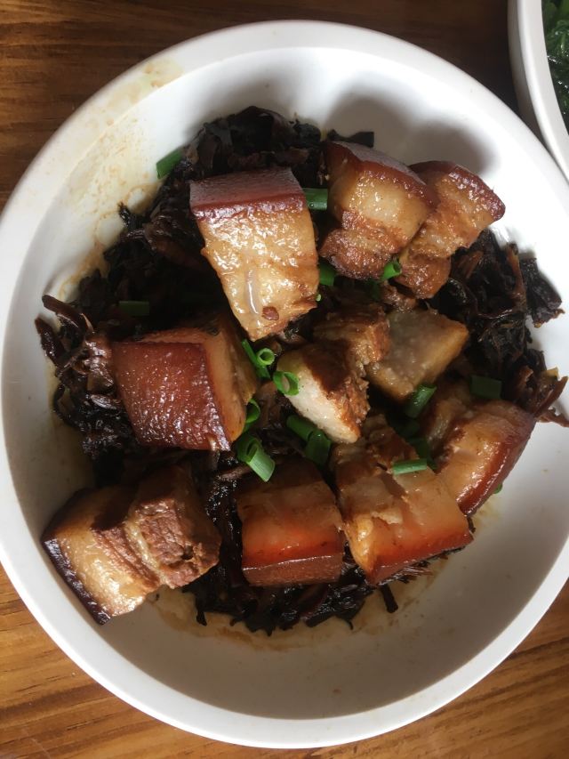 在平水镇镇府旁边,门口有免费停车场。一楼看实物点菜,二楼吃饭基本都是包房。点了特色的臭豆腐、绍兴三鲜、梅干菜肉等。量到是很大,三鲜里面肉丸还可以,鱼丸很淡;梅菜肉肉太肥,梅菜很咸,没有莫干山的好吃。二大一小160元