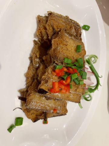 绍兴的国宾馆,环境一流,也太太太漂亮了吧!建筑恢宏大气,花园色彩斑斓,流水潺潺,曲径通幽。 咸肉鞭笋炖盐卤豆腐:一个字:鲜!笋干加咸肉,鲜上加鲜,还放了干香菇,卤豆腐吸足了汤汁的鲜味。 玉米片:里面放了梅干菜和咸肉片一起炸的,很香。 干菜焖肉:这是招牌菜,有大份和小份,人少点小份就行。味道很好。 醉蟹:鲜鲜甜甜,处理得很干净,都剥好了,吃起来很省心。 中餐厅人很少,很安静。服务周到。