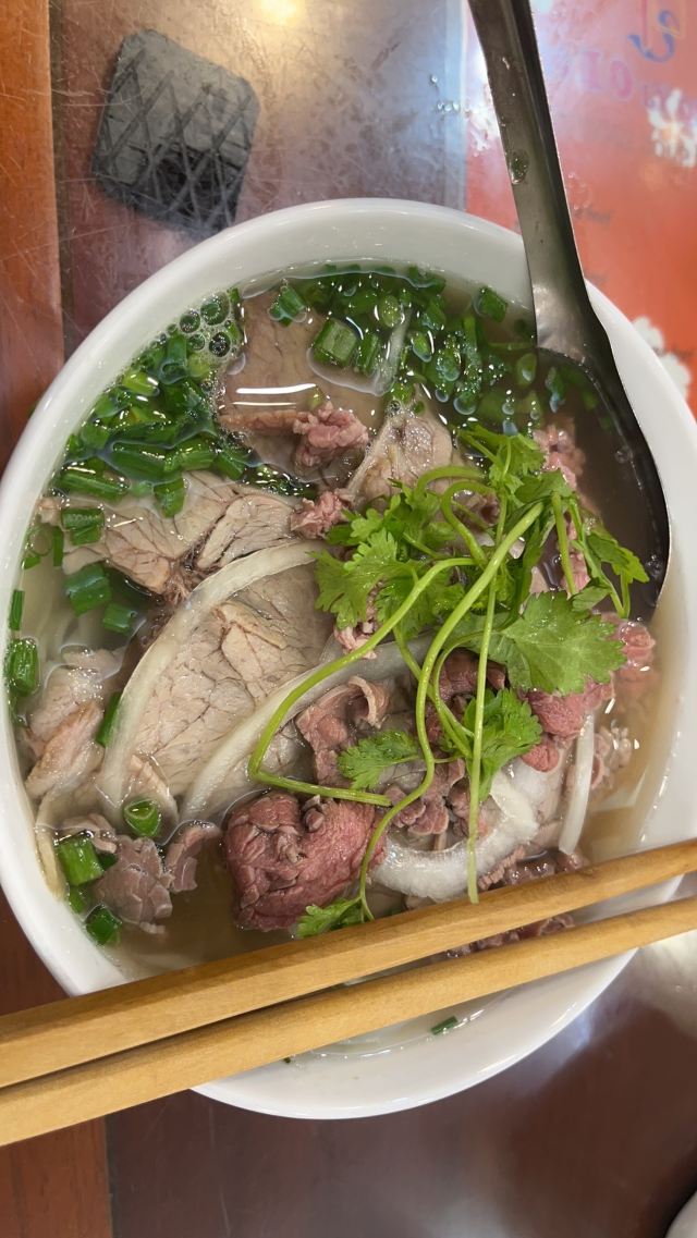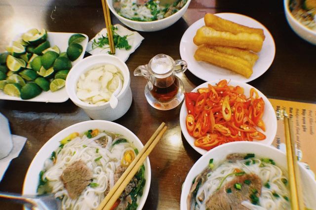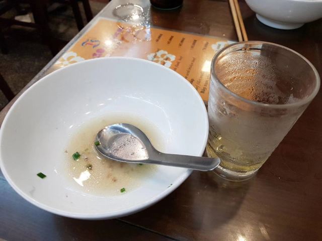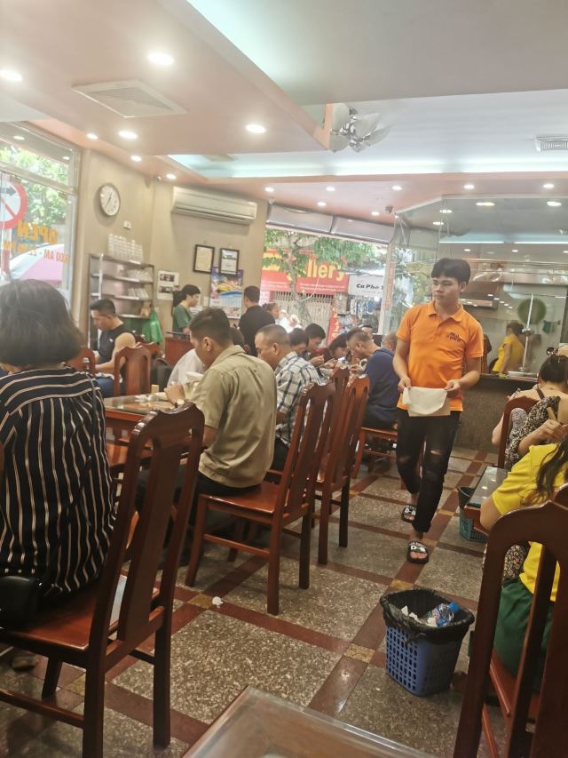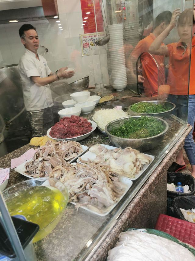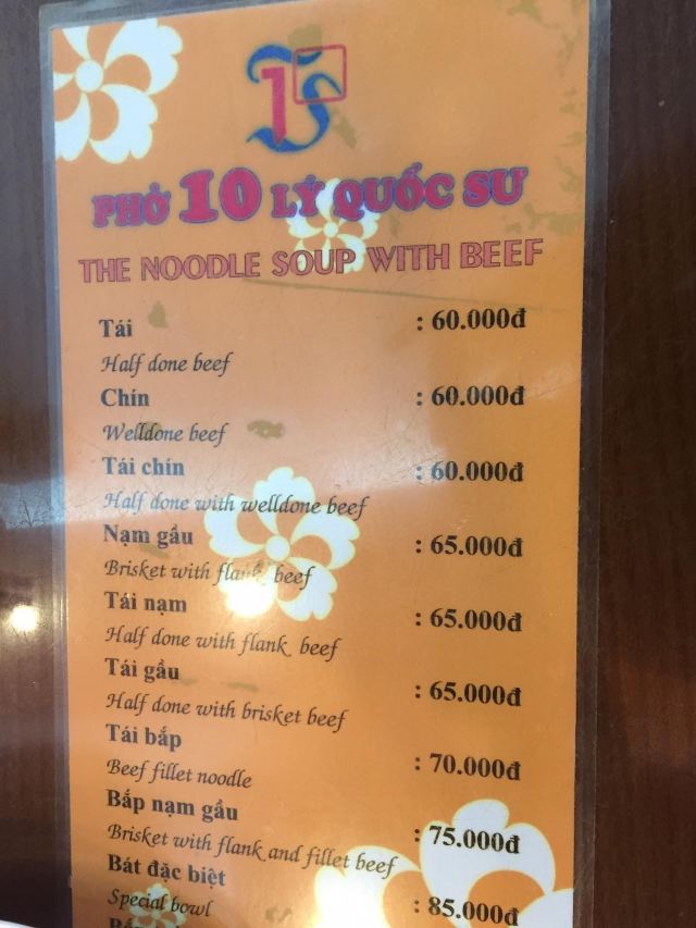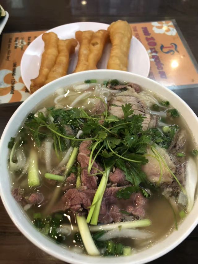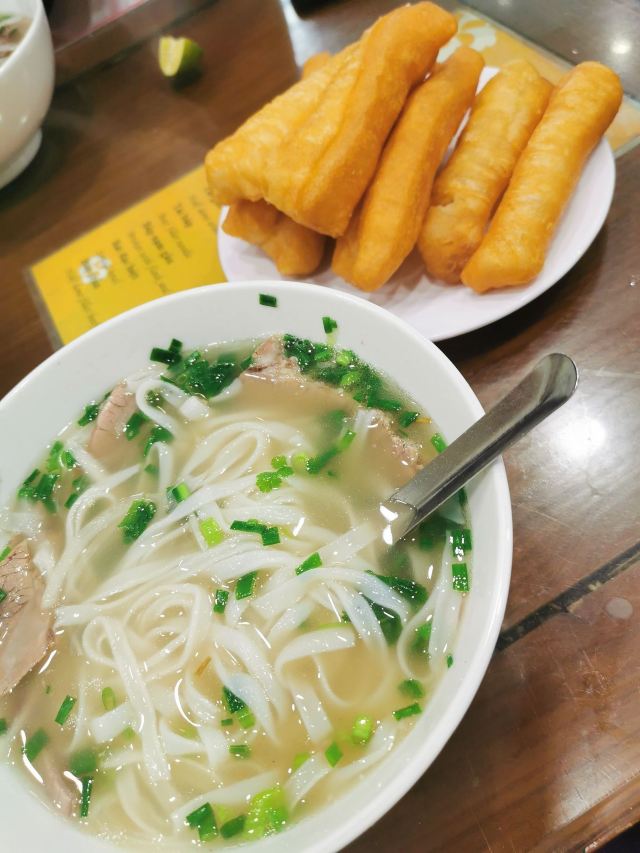 到河内的第一天,酒店员工推荐我们吃这家店。 只有牛肉的,难怪酒店的人问我们要不要吃牛肉。 选了全熟的,然后自己又再点了一份油条。 粉60K一份,油条好像是10。 味道还是不错的,汤底很好喝,泡着油条吃起来别有一番风味。 牛肉量还是挺足的啦,吃到最后感觉有点点吃不下,后来觉得可能点混合的一半全熟一半半熟的会更好吃。 桌上只有柠檬,没有那种一盆菜。加了好多柠檬,喜欢这个味道。 切片的那个辣椒超辣的。 带了宝宝推着推车进去的,服务员特别给安排了一个角落的位置还细心关掉了风扇,有人想过去坐立刻就去说了有baby,给他重新安排了座位。