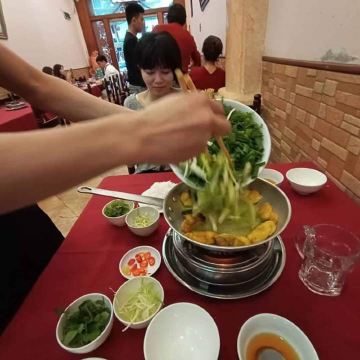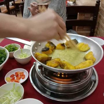 河内几家有名的吃古法烤鱼的餐馆之一,所谓的古法烤鱼就是把一种特制的鱼块放小锅里跟蔬菜一起烤,之后蘸上酱料吃。鱼块很香,蔬菜又正好解油腻,份量不大,但是可以吃得很舒心。啤酒的价格合理,服务员亲切友好。