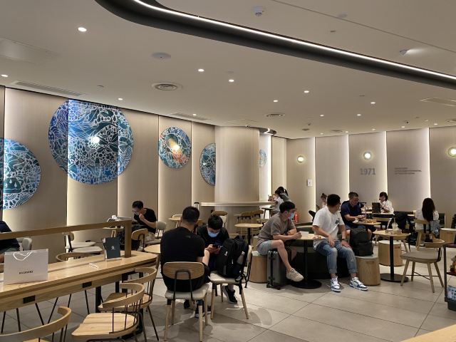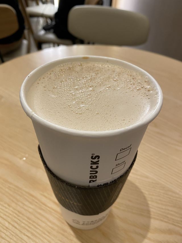 去山东旅游,从青岛坐飞机离开,那天刚好由于天气原因延误了四个小时,无聊就在星爸爸喝咖啡消磨时间。这一家咖啡店位于安检内,是1店,青岛机场有几个星爸爸店,如果是手机点餐的话,进门先问问是哪一家店才好下单。这家店挺大的,门口非常大,有气派,天花很高,座位有不少,当时也不是很多客人。基本上每一站桌子下面都有电源插头,方便客人充电,不错。咖啡不算特别好,没有拉花,我的是拿铁,先倒好的奶,上面再倒浓缩咖啡,就完事了,咖啡面上都起了泡泡。