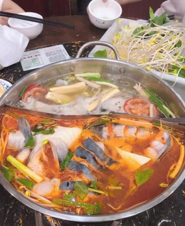 传统酸汤鱼,鱼肉很嫩,吃鱼的时候酸汤味不浓烈,蘸着油碟吃正好,煮青菜吃起来就非常酸了,不过是我喜欢的味道