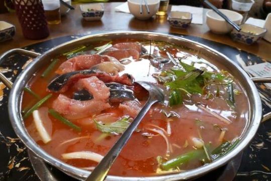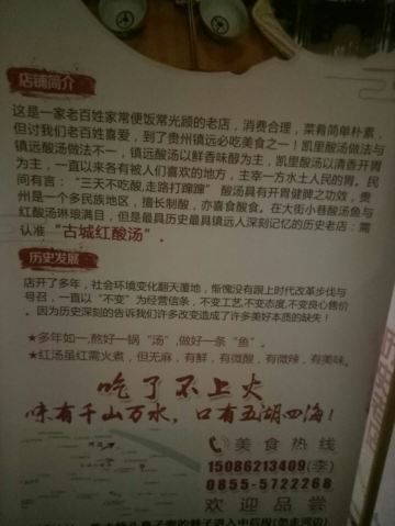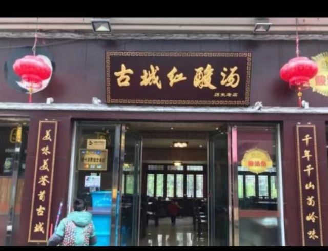 古城红酸汤是镇远有名的老店,成立于1998年,有接近18年的光景,镇远人下馆子必去的一家餐馆,如遇饭点最好电话询问座位。古城红酸汤是镇远最早的红酸汤店,口味优质,工艺正宗。红酸汤分凯里酸和镇远酸,古城红酸汤是镇远酸的代表。