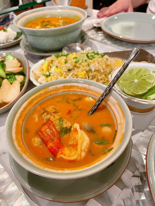 冬阴功汤,咖喱螃蟹,开胃菜拼盘,老虎虾炒面,咖喱鸭肉,老虎大虾沙拉,泰国咖喱,鲜柚虾子沙拉