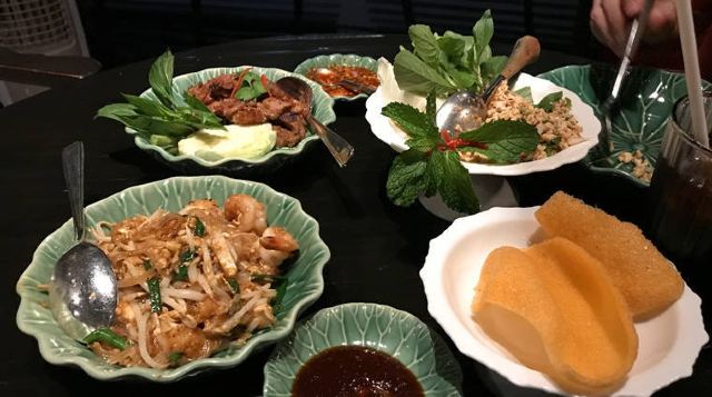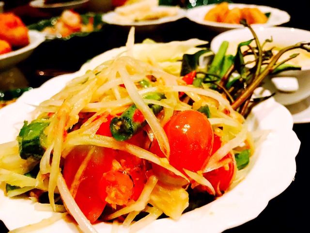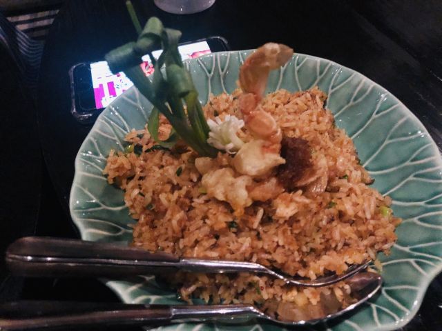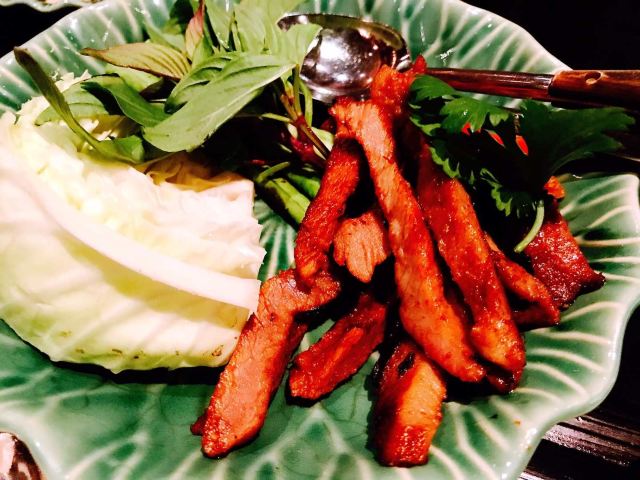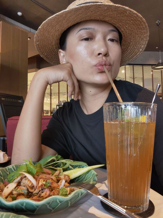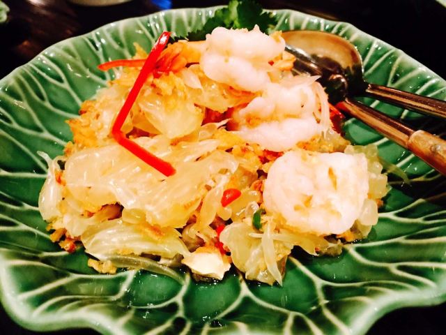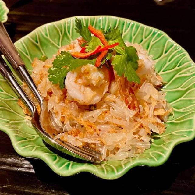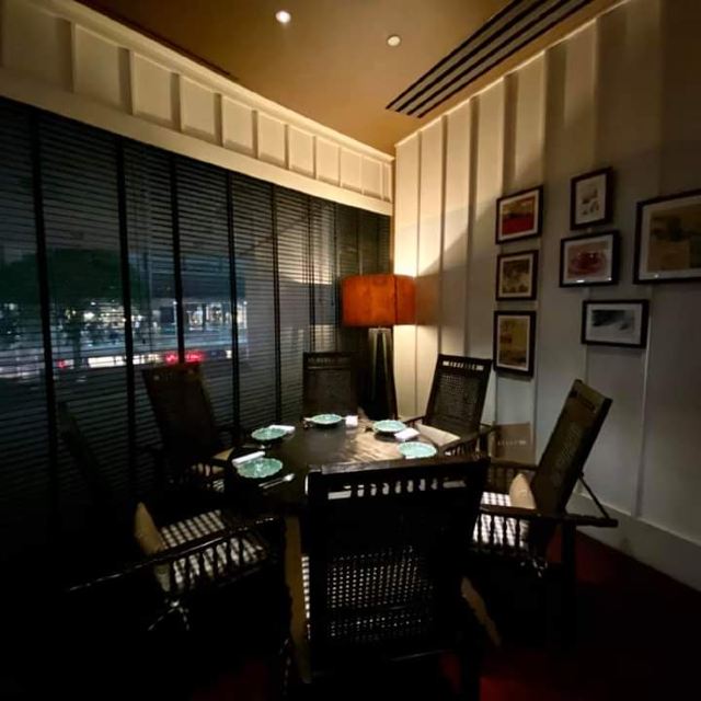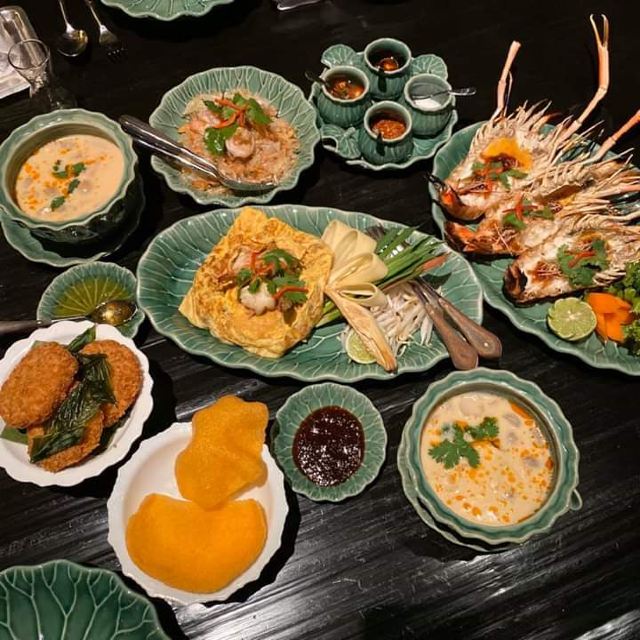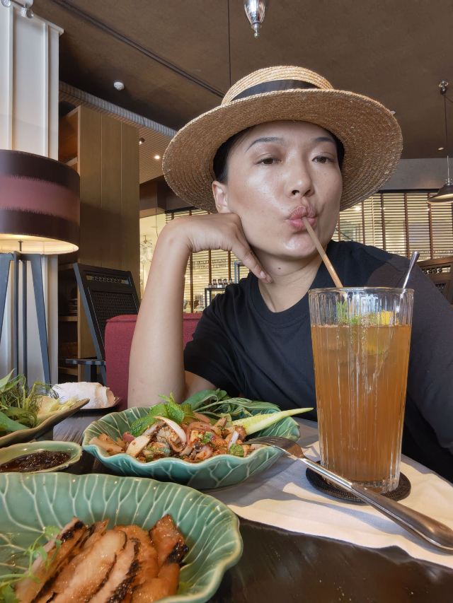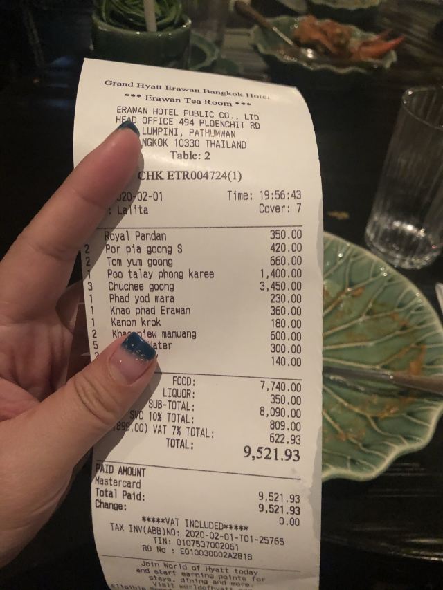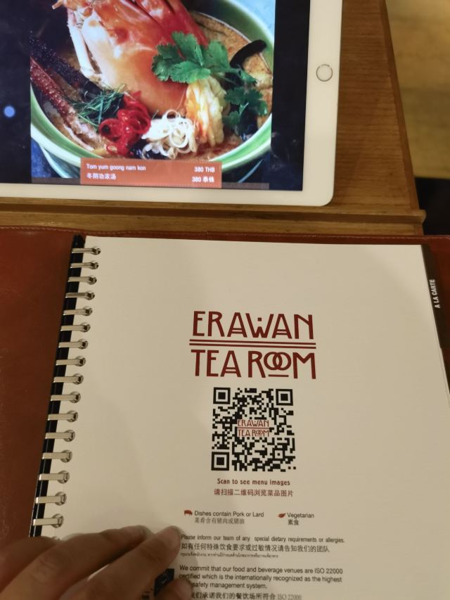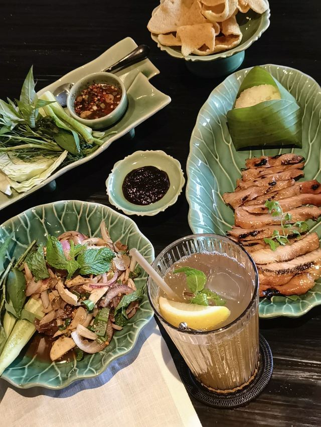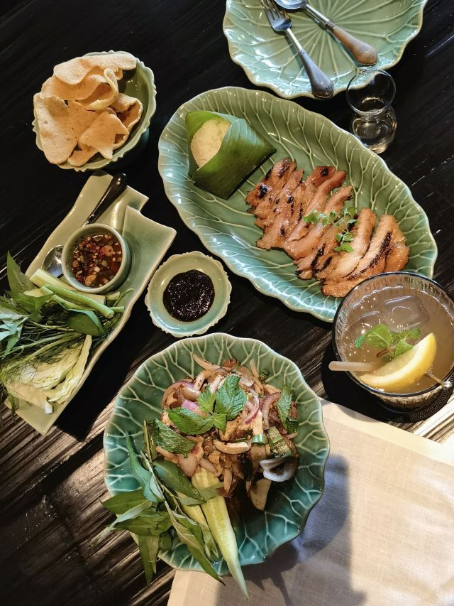 Erawan Tea Room在四面佛楼上,冷气十足一进来灵魂都清透了,菜是精致泰餐,很好吃呀,点了木瓜沙拉和烤猪颈肉不踩雷,那个肉也烤的太嫩太香了叭!服务很好,会收服务费和税。曼谷只要好点的餐厅都在收这两个附加费,肉疼。