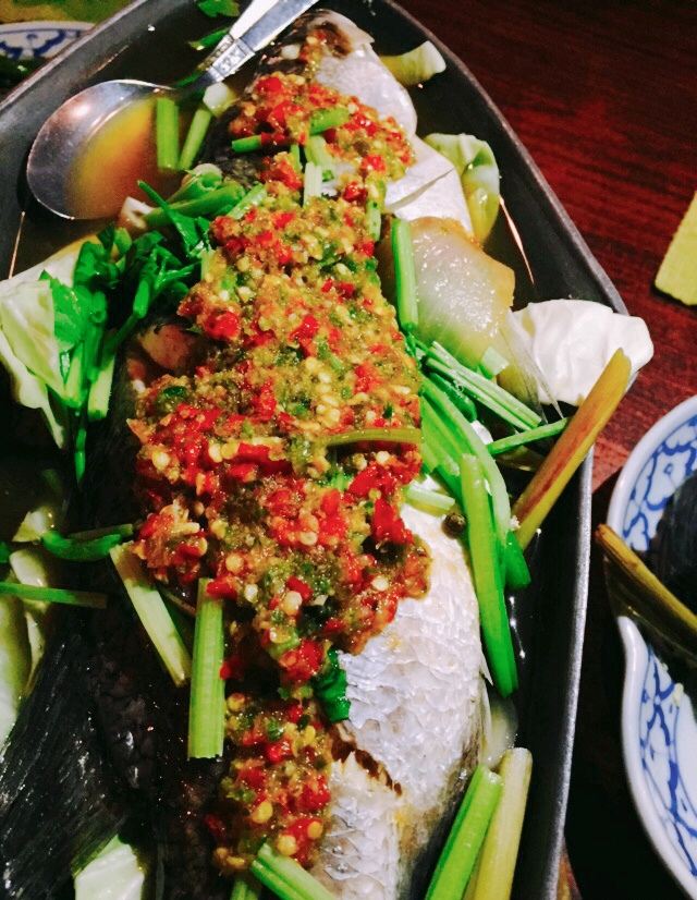 服务员基本上对热门菜的中文很熟悉,直接菜的中文名都可以完成点菜。两个人点了四道菜790泰铢(冬阴功汤、红咖喱虾、菠萝饭、泰式空心菜)味道都很好,强烈推荐红咖喱虾,个头很大,咖喱味也比较浓厚。