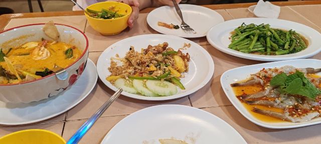 Inter Restaurants since 1981超值,2大人1小童,有𩠌菜有主食,9碟+2泰奶只是$250 港币!香港一个𩠌菜都要超过$100了。 这个价钱,foodcourt 也做不到,难怪是长龙人气店。 某些𩠌菜非常出色,例如铁板蚝仔和青咖哩鱼米线,其他都很不错,只有不合口味的,没有不好吃的。 特地4:30pm 到达,竟然也要排队,全店满座,目测都是泰国本地人。 这餐饭我很满意, 有机会会再去一次。
