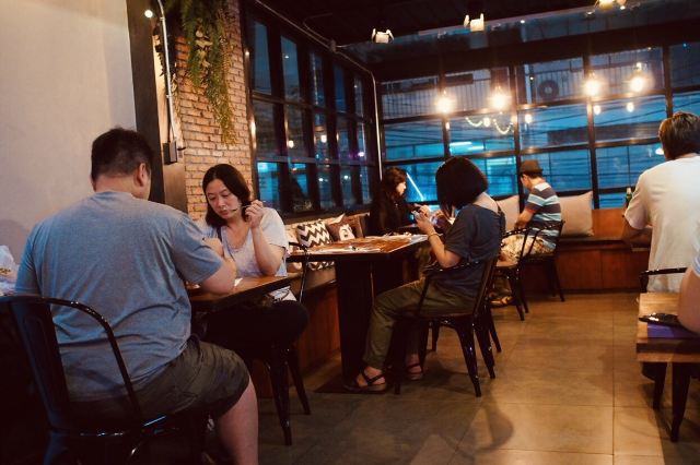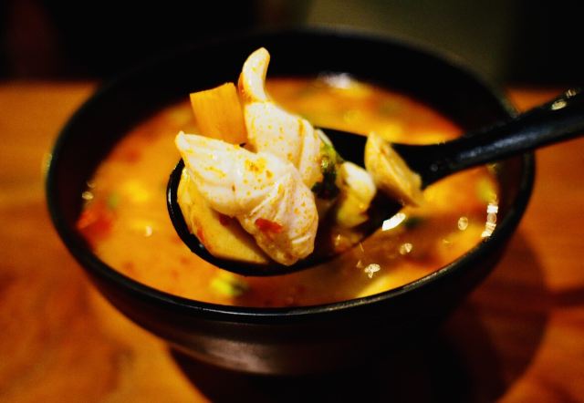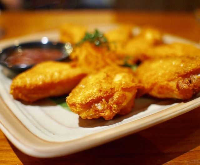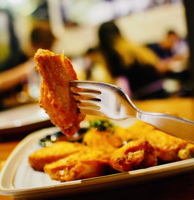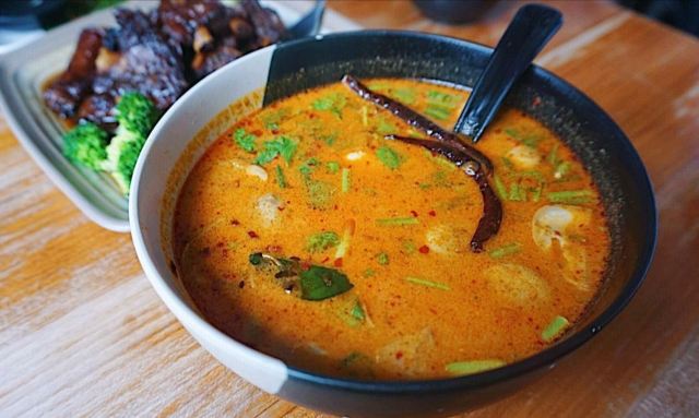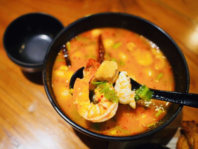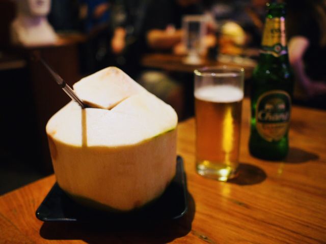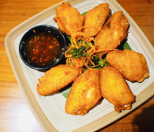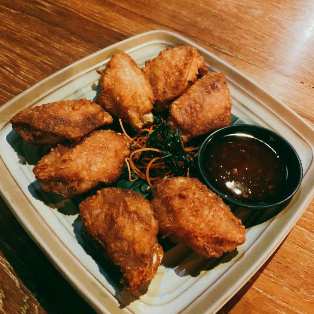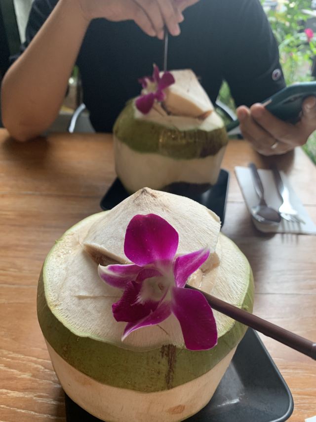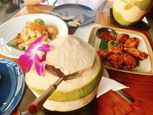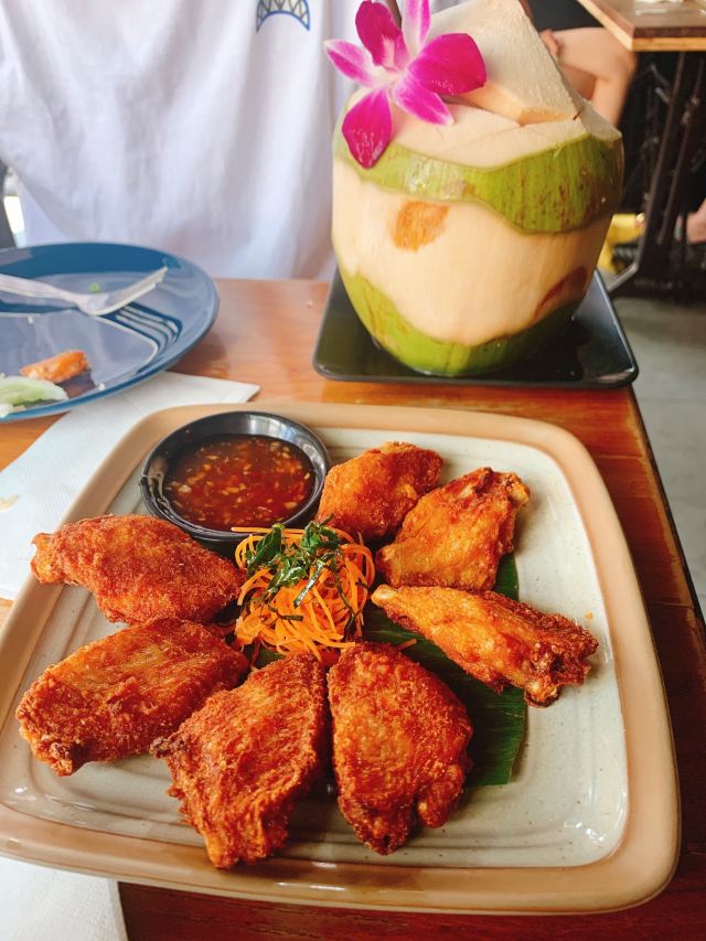 peachsai原來就在我春節去住的Sali酒店斜對過啊,三個月內又來也是真有愛了。在2樓,環境有點酒吧的調調,比較暗,人氣很足,正好有個位子,方位不是特別好,那也隨便了,坐下來再說吧。天太熱,椰子水標配,加上泰國的啤酒一杯。因為泰國菜都是有點辣辣的,還是要來點啤酒解辣。 炸雞翅,泰國其實很多店都有的菜,炸得很香,不過沒有對半切開,一盤吃下來我也是要醉。 冬陰功湯,算是比較扎實的冬陰功,酸度還不是特別酸到位,辣度是夠了,每家冬陰功湯都多多少少有自己的特色,味道都有些詫異。裡面還有魷魚和大蝦和蘑菇,料還是蠻足的。 蝦醬空心菜,到了每家泰國餐廳幾乎都必點,來點蔬菜潤潤。 泰式蛋包飯,裡面的東西蠻多的,蘸甜辣醬好吃,但是量大也是有點吃不掉,來點邊上的黃瓜片,去皮的,很清爽。 芒果糯米飯,泰式的景點甜品,餐後必來一份,芒果叫一個甜。 吃完居然外面還排隊了,什麼神仙網紅店,沒有排隊就吃到也算是小確幸了。樓下和周邊還有洗衣店、按摩店 之類的,再走出去一點就是大馬路了,吃喝玩樂的地方更多。做夢一樣,半年里來曼谷打了3次卡,哈哈。