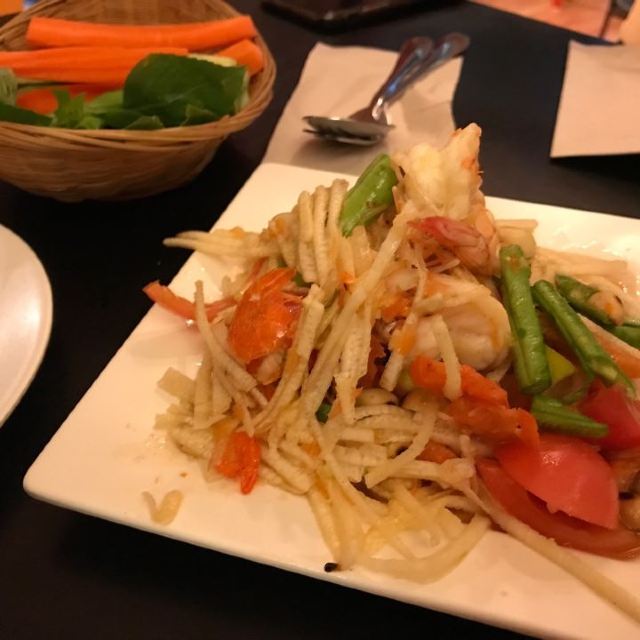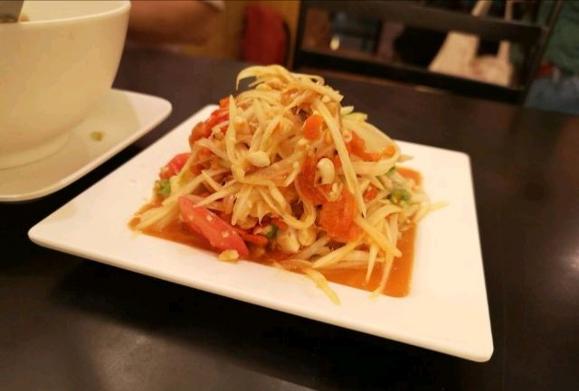 这是一家距离轻轨站不远的沿街餐厅,店内主打以青木瓜沙拉为主的泰国东北部美食。简单干净带点泰式风情的用餐空间,给人舒适的感觉。青木瓜沙拉大拼盘内的沙拉有两种口味,一种是泰式原味,一种是东北口味,还有许多其他配菜,几乎每桌必点。此外,这里的食物又便宜又美味。