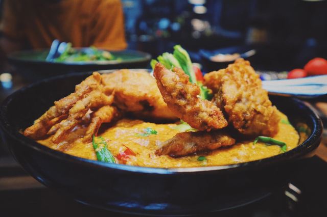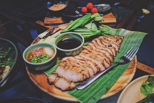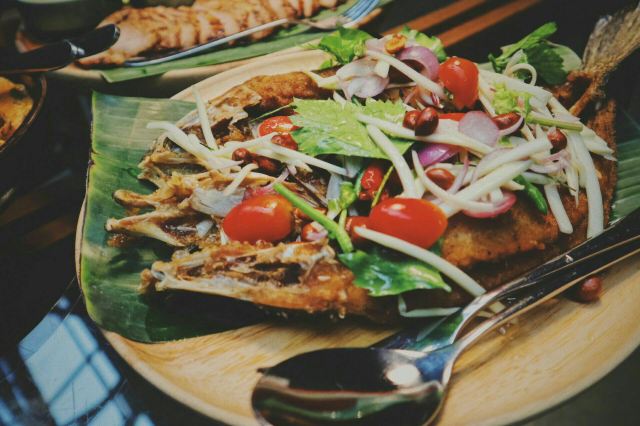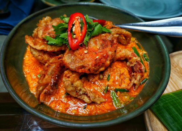 芒果糯米饭,蟹肉咖喱,猪颈肉,鲜花沙拉,炭烧猪颈肉,Pork green curry,Dried fish with watermelon,Sweet and sour neem with grilled catfish