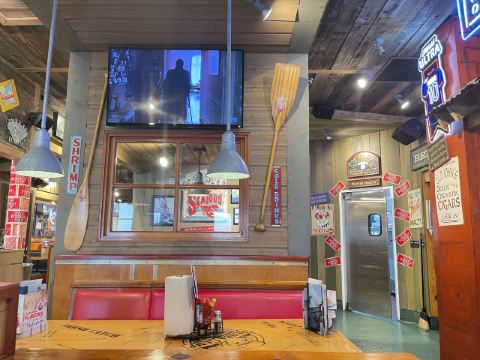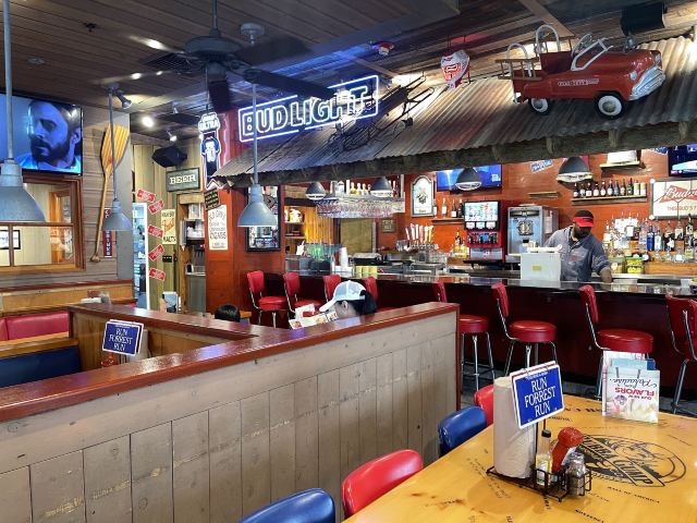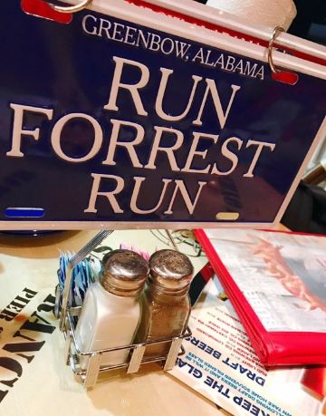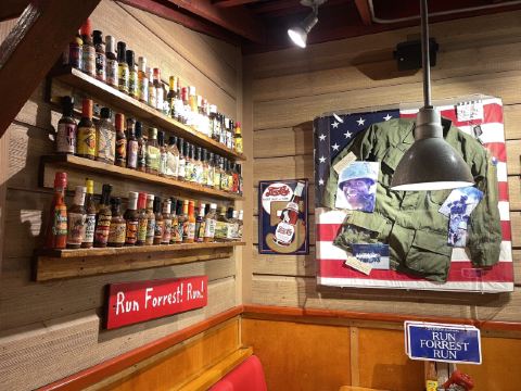 餐厅是以电影《阿甘正传》为灵感的专门烹制虾和其他海鲜的餐馆,装潢也处处体现着电影元素,门外摆放着阿甘等巴士时坐的长椅,餐厅里挂着阿甘的衣服,墙壁上有老照片和电影海报,包括餐桌上有手写的阿甘名言。