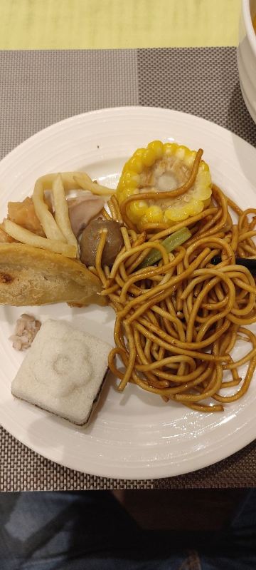 餐厅比较大,座位不太挤,中西餐点心品种都有,只是面包蛋糕都不好吃,曲奇和蛋挞也一般吧,还是本地的中式点心好点,炒面一般都可以,热的馄饨来一碗,最后水果都不错,有热带的火龙果和菠萝。