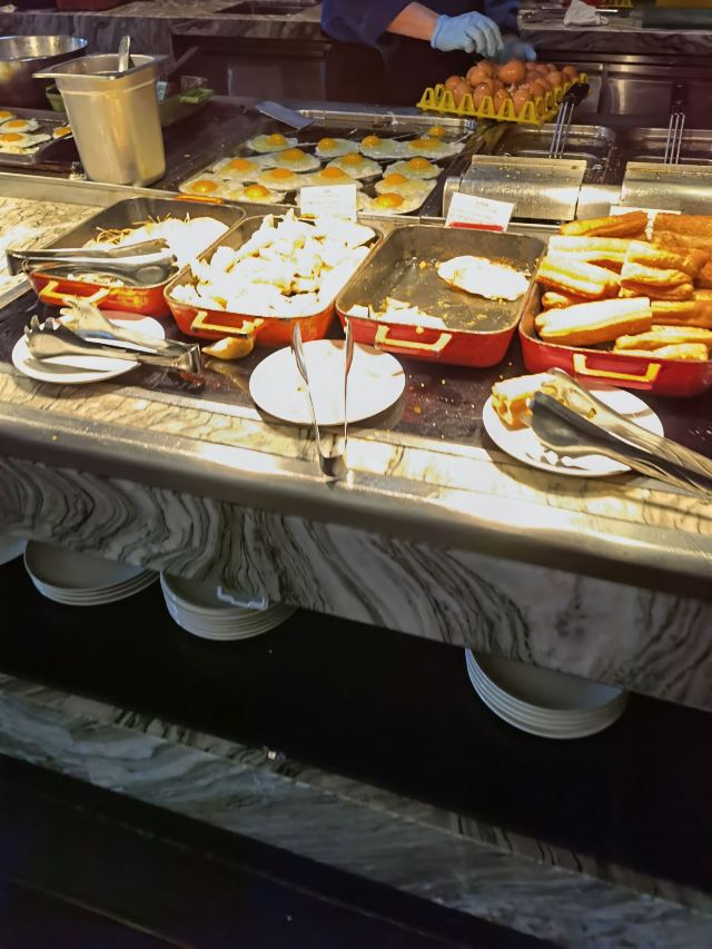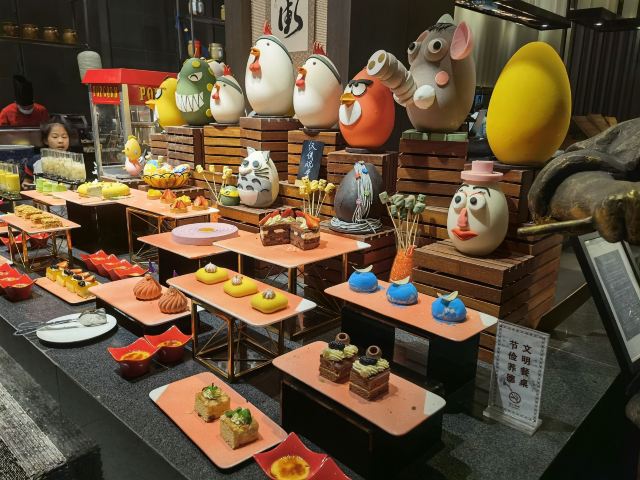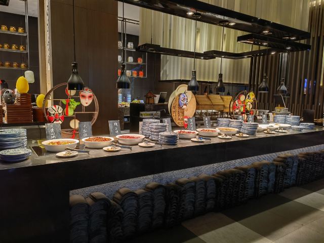 住在万达酒店群的一般都在这里吃,自助餐的就餐环境不错,可以边吃边看园林湖景。不过菜的品种一般,火锅也没什么味道,甜点和烧烤还行