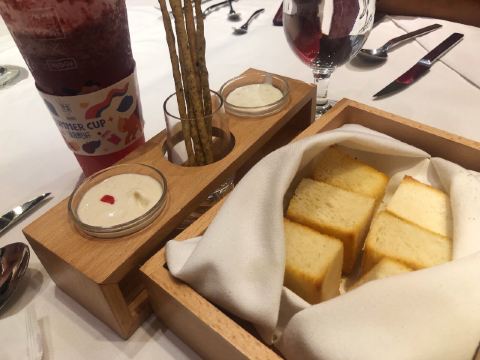 台塑牛排,香颂玫瑰露,热浓浆巧克力拉瓦,焗烤蘑菇佐青梅果醋沙拉,酥皮玉米浓汤,酸梅汤,凯撒沙拉,酥烤牛小排,皇家鲑鱼沙拉,深海龙鳕,面包,意式鲜虾浓汤,酥皮海鲜清汤,翡翠南瓜汤,法式香煎鹅肝沙拉,牛小排清汤,蜜桃甜酒,冰卡布奇诺,皇家牛排,香煎鹅肝沙拉,小牛菲力,法式蘑菇浓汤