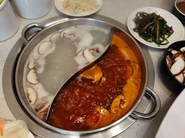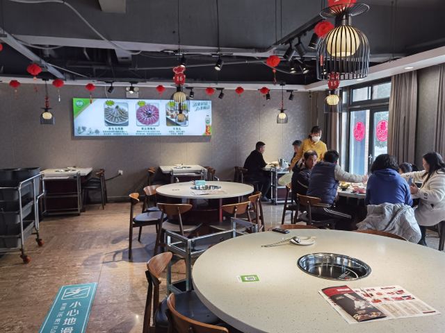门店很显眼,门前有免费停车位,路边也可以停车。餐厅比较干净,服务不错,服务员态度很好。一楼是散客大厅,二楼有包间。 点的鸳鸯锅,小料是自助式的,麻酱、耗油、辣椒油等一应俱全。还有免费的小凉菜、水果。 涮品量还可以,感觉龙利鱼很不错,羔羊肉、后腿肉好吃,雪花牛肉一般,虾滑一般,蟹肉棒一般。 总体感觉还可以。人均100元左右。