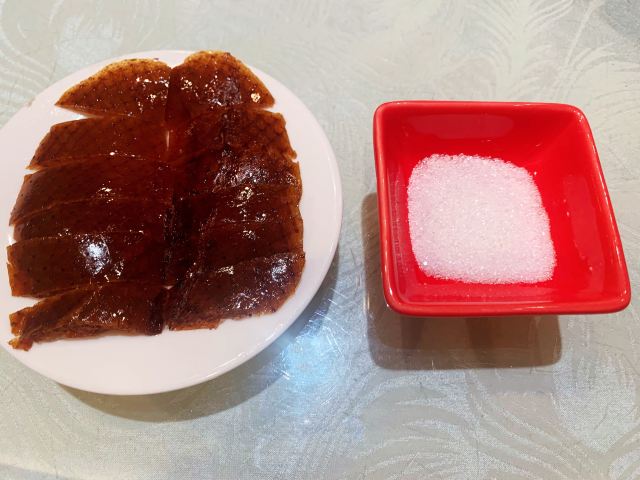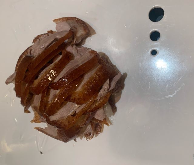 这家烤鸭店里的烤鸭味道纯正,非常不错!