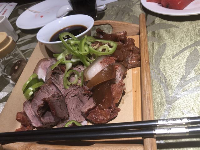 不修边幅的一休哥和同事们出差住在附近,搜索了一下找到这家; 按照外上海点菜的习惯,我们点了5菜一汤一主食,结果草率了……菜量实在是有点大…… 我们点了当地特色的驴肉和本店特色的烤乳鸽,只能说:太香了!!都顾不上聊天闷头吃饭