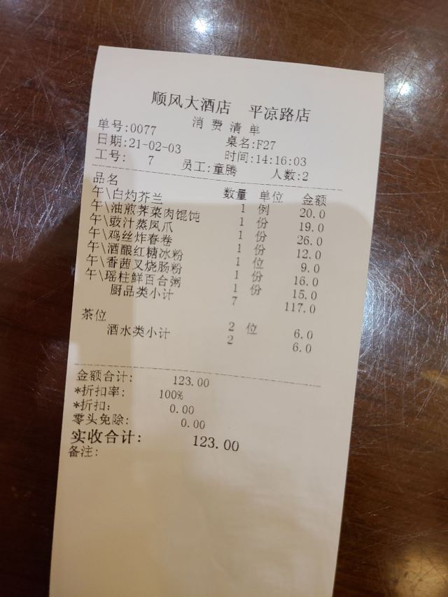amydog2021-2-3 立春日 🍡第一次的顺风午茶 小伙伴一直想试试顺风的午茶,不好意思,此处省略几万字,因为已经心心念念了好几年😂每次想起的时候总是机缘巧合完美错过或者发现要排队等位 这次终于在过年前达成心愿了 【环境】散席环境怎么说呢,有些复古老派吧,但直观感觉是旧旧的,不太喜欢,趁着去洗手间机会,走到后面包房区域猫了猫,好看了很多 【口味】 |豉汁蒸凤爪^26,还不错吧,至少酥烂了,艾小米对凤爪最要紧的指标就是够不够酥烂 |香茜叉烧肠粉^16,便宜得不像话,所以东西也就马马虎虎,肠粉不够滑,鲜美味道也没有 |酒酿冰粉^9,小伙伴客气地特地为艾小米点的…粤菜点心里点冰粉,不知道说什么才好,有点点难吃就对了 【服务】买单等了不少时间,也不知道为什么
