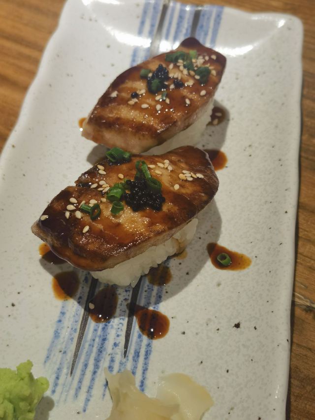 鹅肝寿司鹅肝肥大,闻着焖香,入口回味。 牛肉盖饭分量十足。 牛舌烹饪后的纤维韧性适当,好咀嚼不粘牙。 煎饺,沾着调料口感味道俱佳。 海鲜拼盘,金枪鱼、三文鱼大西洋鲑、鱼子,个个色泽诱人。 乌鲁木齐路安福路路口,闹中取静,环境静谧,适合朋友小聚和约会。