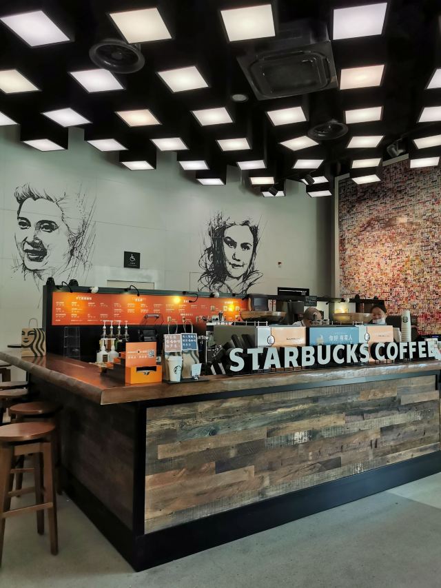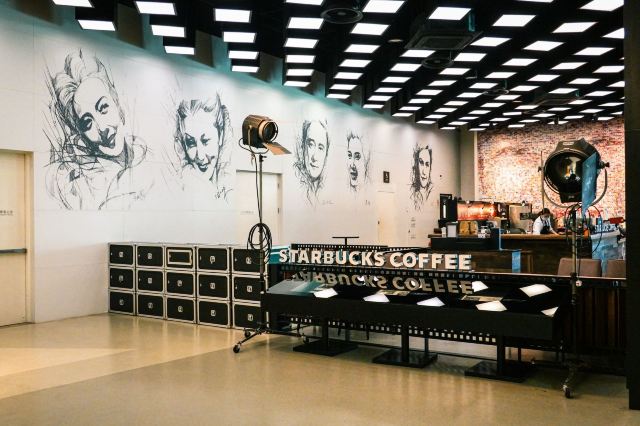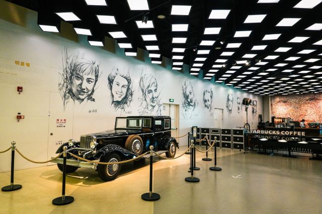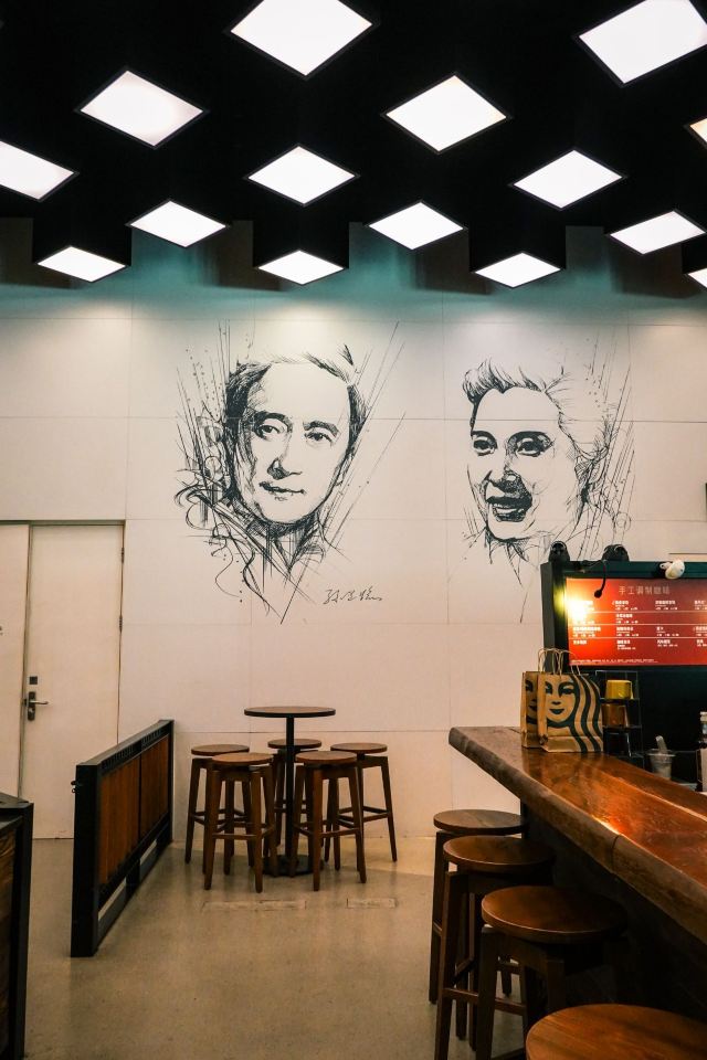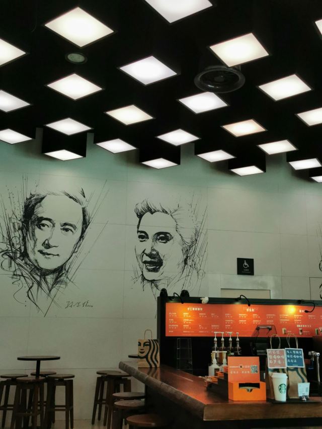 参观完电影博物馆,临近出口的地方没想到居然还藏着一家小小的星巴克😃,面积不大,也就十来个座位,但是很有“上影”特色哦: 首先墙上画着八位老一辈电影艺术家,那在当年可都是响当当的腕儿啊,有孙道临、上官云珠、秦怡等等,我们的父辈可是看着他们的电影长大的啊,《乌鸦与麻雀》、《渡江征察记》、《永不消失的电波》等等都是那个时代的经典,这些德艺双馨的老艺术家铸就了上海电影的辉煌岁月✨。