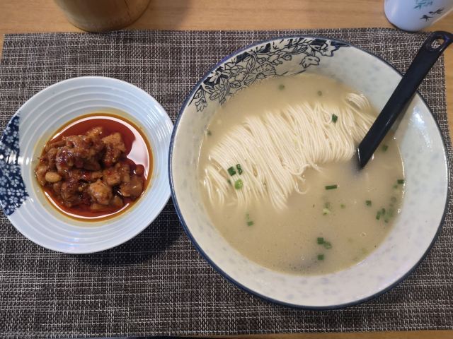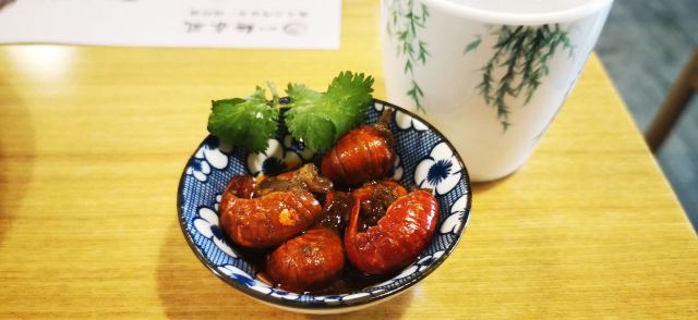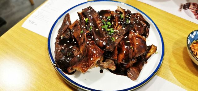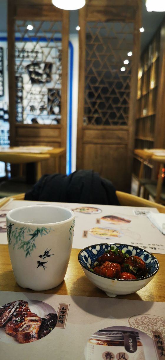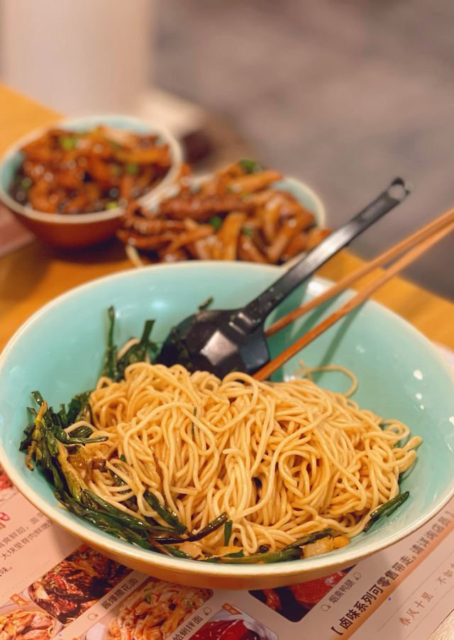 泡泡龙他爸据说是家网红店,擅长到处尝鲜的中学老同学介绍的,前阵呆在家里时间多,就从他家外卖了一些秃黄油、蟹粉之类,质量很不错,送货则较慢,要隔天,价格不便宜。近两周天气好起来,就现场去尝尝,第一次开车去的,店在吴兴路靠近淮海西路,吴兴路要从南向北单向而行,接近路口在路边马路停车位停一下,每小时15元。店面不显眼,快到门口了也没看出来。进门发现空间规整简洁,菜单上选择也挺多,要了春风辣肉面和小龙虾拌面,加了一个本帮酱鸭,再给小家伙打包回去一份拌面。味道还真不错,量不算多,价格稍贵,但生意挺好,年轻人居多,也有说是经常来的老太太