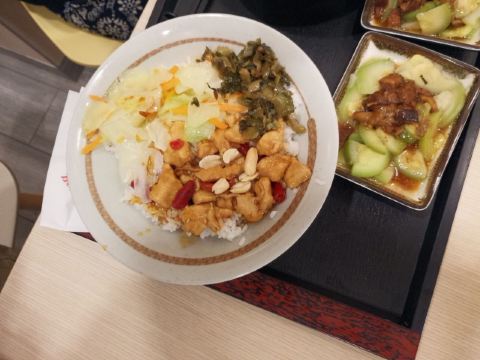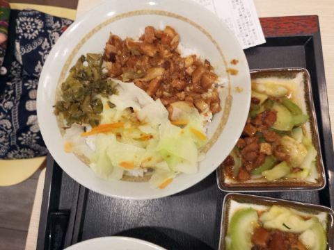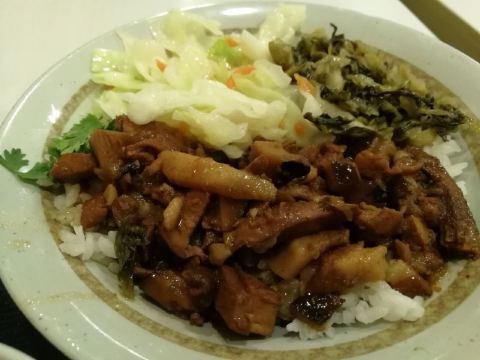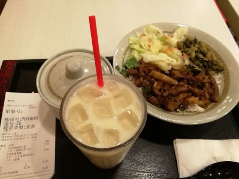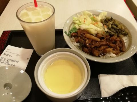 meteorakira中午到这里来吃的中饭,我们点的「台湾卤肉饭」我觉得一如既往的喜欢噢,卤肉很入味,里面还有香菇丁,香香的很好吃呢,还有「夜宵酱滋嫩猪排」也不错,外面的酱汁有点甜甜的味道,猪排咬起来也很嫩的,还有「现磨豆浆」也很喜欢,豆香味浓郁噢。