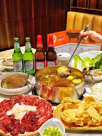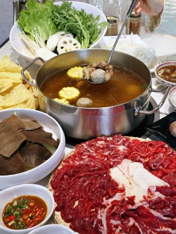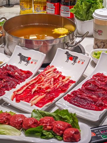 吊龙,生牛肉丸,招牌锅底,匙皮,嫩肉,雪花牛肉,沙茶酱,肥胼,芥兰牛肉炒饭,五花腱,匙柄,嫩牛,牛舌,潮汕粿条,肉丸子,酱油,炸腐皮,胸口朥,牛肉火锅,牛百叶,现切鲜牛肉