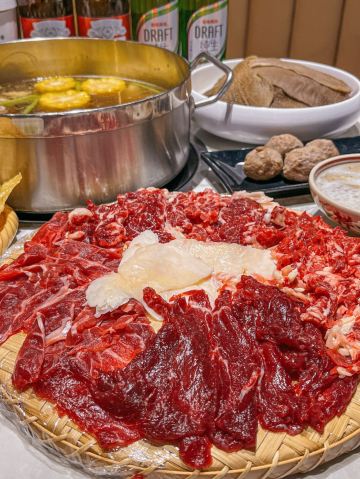 JinRi Niu Shi虽说潮汕牛肉火锅是低脂又健康的美味🥩 但吃货哪有不找借口吃吃吃的 吃上这一口 暖呼呼地过秋天🍂 今日牛事尊滴太受欢迎了 吃午餐的接着吃晚餐的 吃晚餐的接着吃宵夜的 这么大的餐厅总是坐满了人 烟雾缭绕中宛若仙境 就像到了美食天堂 点一份便宜的特色锅底就足以 里面还有牛肉和牛肉丸 牛肉酥烂、肉丸爆汁、萝卜水嫩,都是绝绝子 新鲜现切的牛肉放在对应名称的盘子里 让食客们吃得明明白白 平时一贯点的嫩肉肥胼不会出错 这次尝试了一下脚趾肉 带着点软糯糯的筋尊不错 生丸又大又圆又Q弹 比普通牛肉丸更胜一筹 甜咸搭配还点了糕烧双色 两个人小份就够 香甜拉丝敲好吃