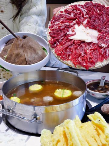 YoYo_6L9B3M6I虽说潮汕牛肉火锅是低脂又健康的美味🥩 但吃货哪有不找借口吃吃吃的 吃上这一口 暖呼呼地过秋天🍂 今日牛事尊滴太受欢迎了 吃午餐的接着吃晚餐的 吃晚餐的接着吃宵夜的 这么大的餐厅总是坐满了人 烟雾缭绕中宛若仙境 就像到了美食天堂 点一份便宜的特色锅底就足以 里面还有牛肉和牛肉丸 牛肉酥烂、肉丸爆汁、萝卜水嫩,都是绝绝子 新鲜现切的牛肉放在对应名称的盘子里 让食客们吃得明明白白 平时一贯点的嫩肉肥胼不会出错 这次尝试了一下脚趾肉 带着点软糯糯的筋尊不错 生丸又大又圆又Q弹 比普通牛肉丸更胜一筹 甜咸搭配还点了糕烧双色 两个人小份就够 香甜拉丝敲好吃