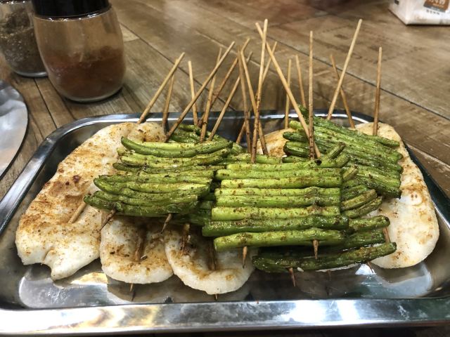烤羊排,鲜带子,烤金针菇,锡纸花蛤,啤酒,烤鲳鱼,酸辣土豆丝,牛板筋,烤鸡心,凤爪,锡纸花甲,锡纸猪脑,烤玉米,碳烧羊腿,羊肉串,烤生蚝,烤翅,烤扇贝,掌中宝,锡纸三鲜金针菇,烤茄子,烤羊腿,烤牛舌