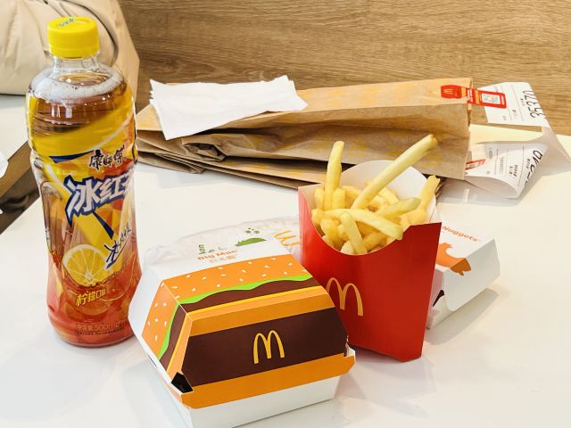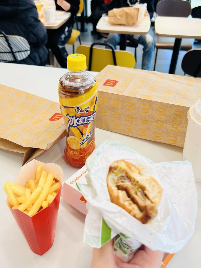 McDonald's (wankehaishangchuanqi)很久没吃麦当劳了🍔,园区里的中午,生意是非常滴好,单子满天飞,店员不是在装食物,就是在叫号[笑哭] 提前小🍊下好单,到店基本就🉑️领到了,就是位子有点难找,堂食的人还是很多的; 点了份套餐,薯条🍟、可乐和汉堡,高热量食物难办吃吃还是满开心的,个么晚饭只能吃草了!