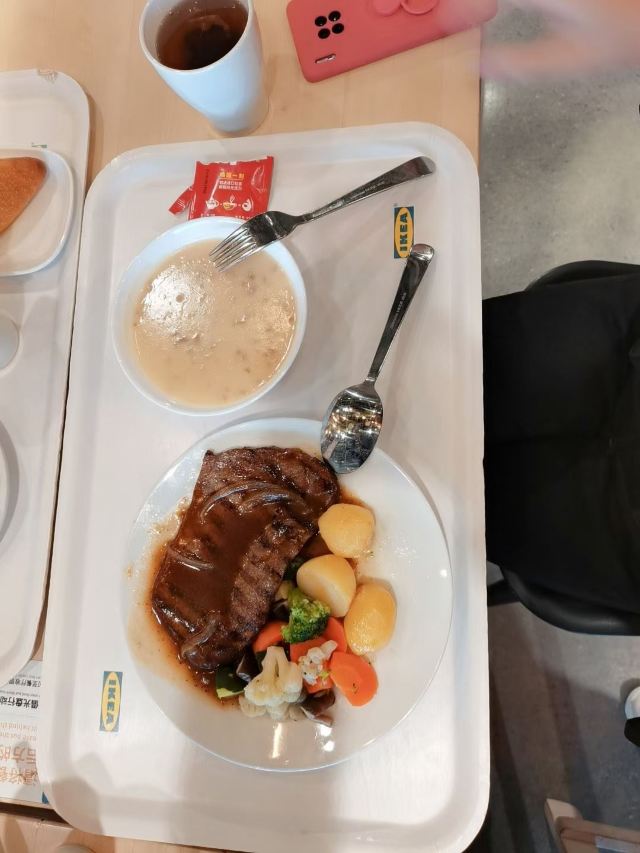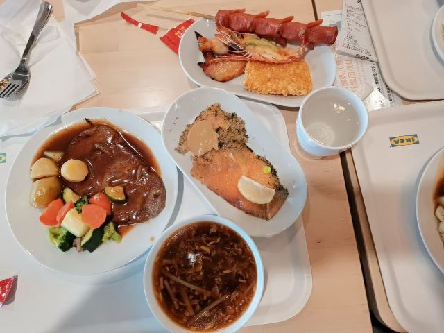 宜家餐厅的优惠力度越来越弱,优惠限制越来越多,但来这里就餐的人依旧很多,大概喜欢这里比较自由的用餐氛围吧。以前12岁以下儿童有免费餐,现在只能买专属于的儿童餐。现在周五是会员日,以前所有主食对折,现在仅针对某款套餐对折(现在是牛排)。儿子喜欢他们家的意面和鸡腿,我喜欢瑞典肉凡。蛋糕价格12-20元,品质不太好。饮料的话会员工作日咖啡都是免费的。其他饮料都是气泡型,而且太甜,个人建议还是喝白开水。