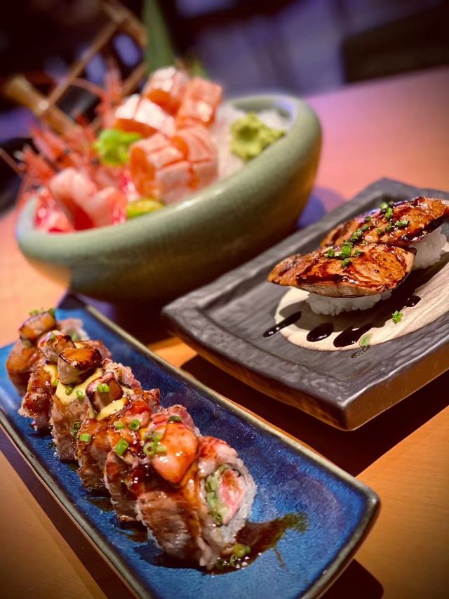 鹅肝寿司,三文鱼,厚烧牛舌,肥牛寿喜锅,鳗鱼饭,厚切三文鱼腩刺身,牛小排鹅肝卷,天妇罗拼盘,生牛肉,牛肉鹅肝饭