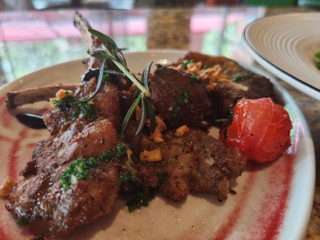 这抹西班牙红适合圣诞来打卡 上海最近的商场是一家接一家的开,这次来了这家新开的BROWNSTONE,真是里里外外火出新高度,开业的时候还抽奖iphone13pro max,现场看了个路人抽中简直羡慕死了。 作为西餐的狂热爱好者,西班牙菜鲜美又奔放,海鲜配上葡萄酒让人像度假一样放松,这道传统西班牙海鲜铁盘饭我们几个小姐妹分的干干净净,米饭Q弹入味,三文鱼和虾拌在一起口感超丰富~ 作为主菜,我们一人来了一块烤羊架,羊的风味主要来自脂肪,店里做的没有腥味,一块下去满足感不言而喻,秋冬来一份羊肉滋补还很有情调。 小菜推荐香煎小蘑菇和火焰橄榄油爆虾,如果是情侣约会,油爆虾点火很有仪式感,旁边桌女孩子都忍不住过来拍照,很有面子。 店里还有一个特色是西班牙果酒叫Sangria,水果在酒里浸泡的时间足够长,和葡萄酒的香味融为一体,新鲜葡萄红酒渍过的梨混搭出的风味简直一绝,朋友不能喝酒的话可以点无酒精的调制饮料,能喝酒的朋友千万别错过,必点。 店里已经放上了圣诞树,圣诞过来约会绝对物超所值。