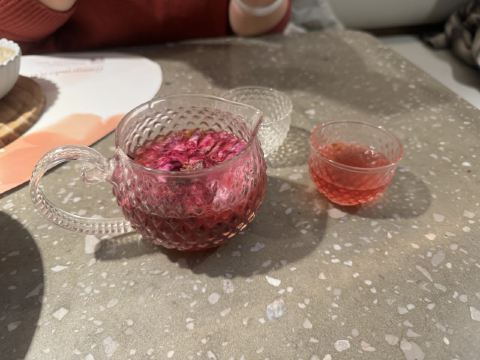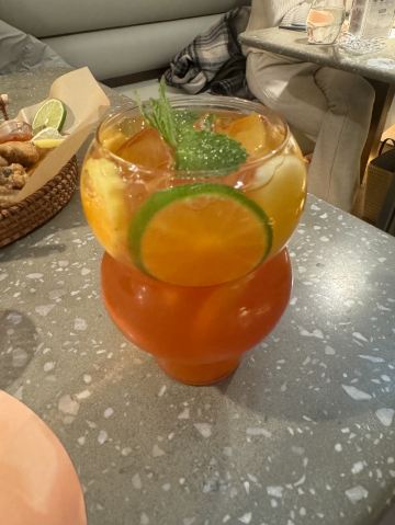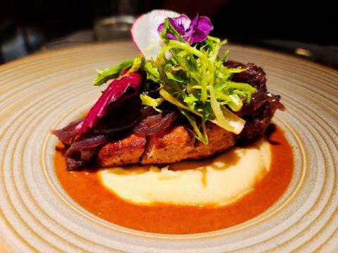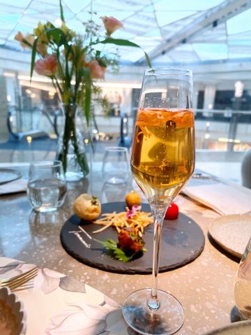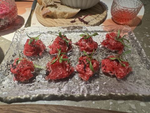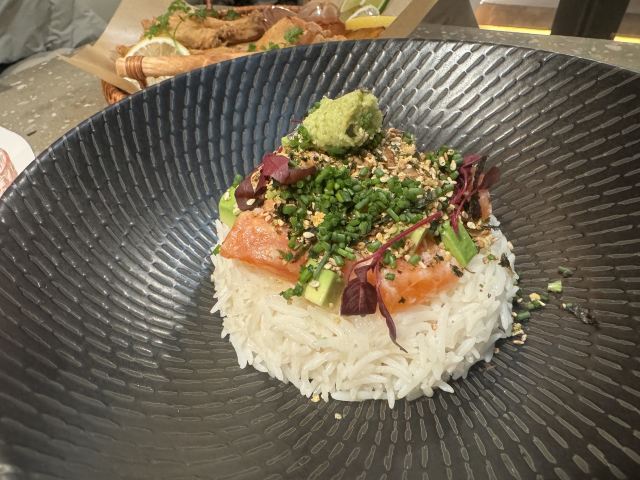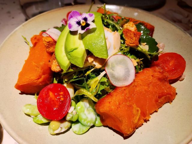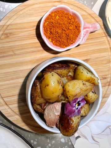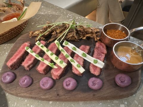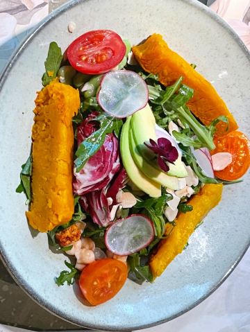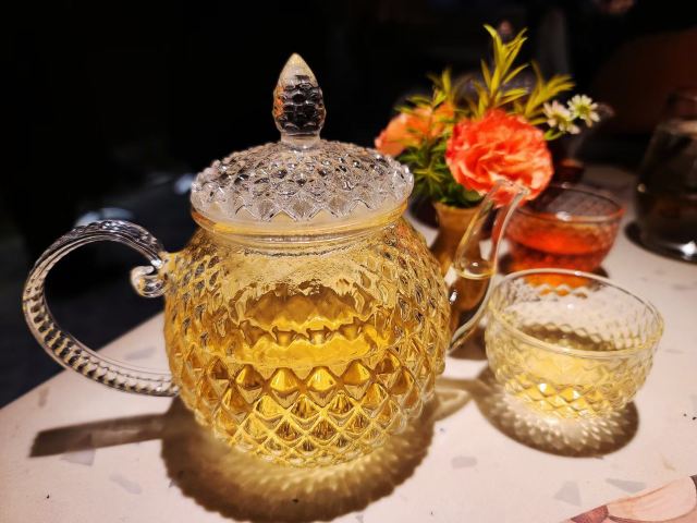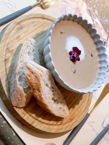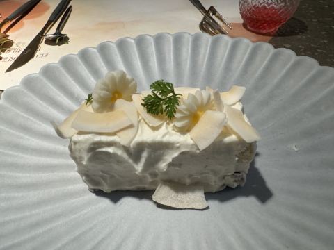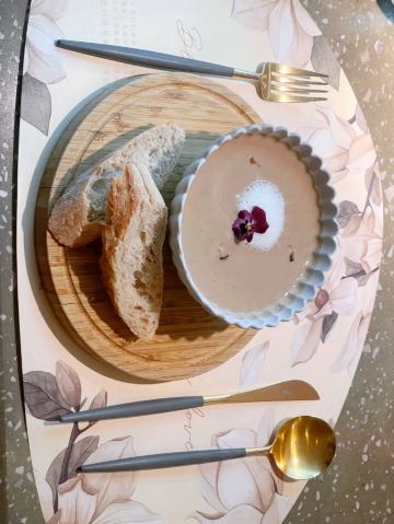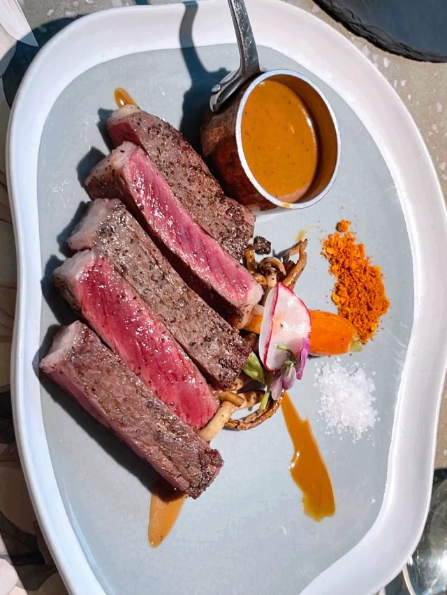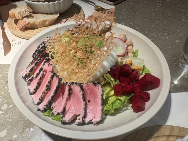 食神牛一家以花为主题的融合性西餐店,门面花团锦簇内部装修清新自然鲜花环绕,特别适合约会。菜品饮料也搭配鲜花,配色造型都很好看。 接待蛮热情引领就坐倒上柠檬水,店员蛮多所以有啥需求非常及时到位,服务亲切细致就是上菜速度太快,有点赶着吃的感觉。 团购了花厨经典双人和牛套餐688元, 花厨特色菌菇汤,配餐前面包,汤很浑厚淡淡的鲜味,面包香酥松脆。 蔓越莓玫瑰花果茶(热)玫瑰清香不是很甜微酸,热热的蛮暖胃。 南非缤纷水果茶有各种果片酸甜冰爽。 金枪鱼能量沙拉,金枪鱼外面包裹着黑芝麻细酥松嫩,里面还有生菜、火龙果,牛油果,蘑菇等,口味清淡爽口。 黑松露和牛薄切三重奏,新鲜的生牛肉口感柔嫩细腻,搭配烤好的香蒜面包还有3种小调料,口感非常有层次。 花厨柠香凤梨吮指鸡翅,鸡翅一分为二后炸制的,椒盐咸鲜鸡皮香脆鸡肉酥嫩,烤凤梨酸甜水润蛮解腻。 主厨秘制和牛眼肉配山笋,牛排要了5分熟肉质很柔嫩口感不错,山笋细脆豆泥点缀,还配了紫薯泥、凤尾菇,佐的酱汁蛮鲜香。 打卡收藏送桂花豆花,桂花味馥郁豆花水嫩细滑清甜留香。 低温慢煮三文鱼波奇饭,用的猫牙米很柔顺软糯,三文鱼蛮大块柔滑肥嫩,牛油果、葱花、芝麻点缀,芥末较为冲辣,拌汁确实如店员提醒的那样比较咸只能放一点点。 “春日呢喃”杏仁巧克力椰香蛋糕,椰子脆白巧克力花点缀,杏仁慕斯包裹,夹层的蛋糕松软,椰奶冻椰香淡甜,巧克力冻浓郁味重。 餐点的制作蛮有创意特色,食材味道也蛮不错,如果用餐的节奏能把握得好一点就完美了。