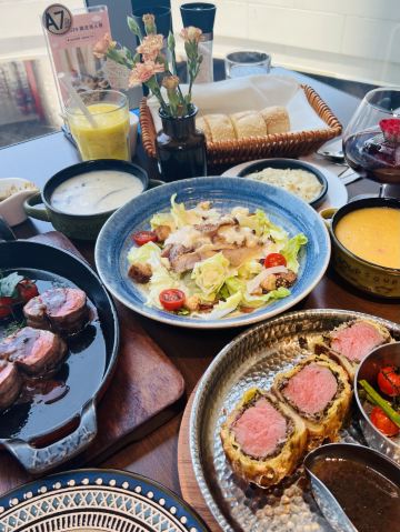 餐前面包,菲力牛排,惠灵顿牛排,松露肉眼牛排,库伯沙拉,松露风味牛排饭,牛肝菌奶油意面,软香面包,奶油蘑菇汤,百香雪酪