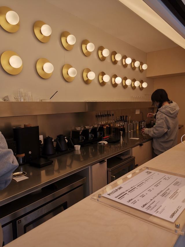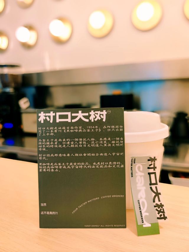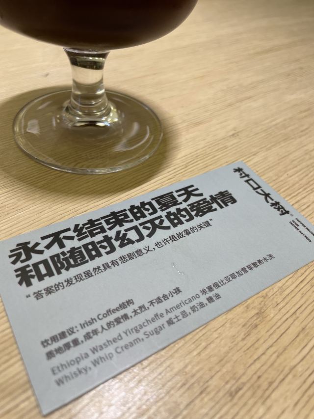 某一个周末从医院出来牙痛到心情很糟,又是阴雨天,你懂的,碰巧路过村口大树,瞧见里面温暖的光顿时好了不少。 店家在小卡片上印上了村口大树的由来,确切的说更像是一个玩笑,也不知道是不是真正的原因。 店不大,几个高脚凳,和紧邻小间的有限空间里搭出了简约了设立,最让我喜欢的还是黄色的光,格外是在阴雨天,没几个人,难得的安静。 点了一杯美式,单品豆,后来才知道这是家网红,后悔没有尝推荐的特调,就留下次吧。