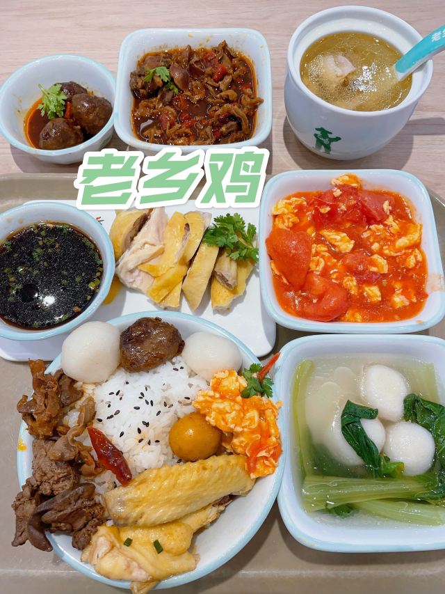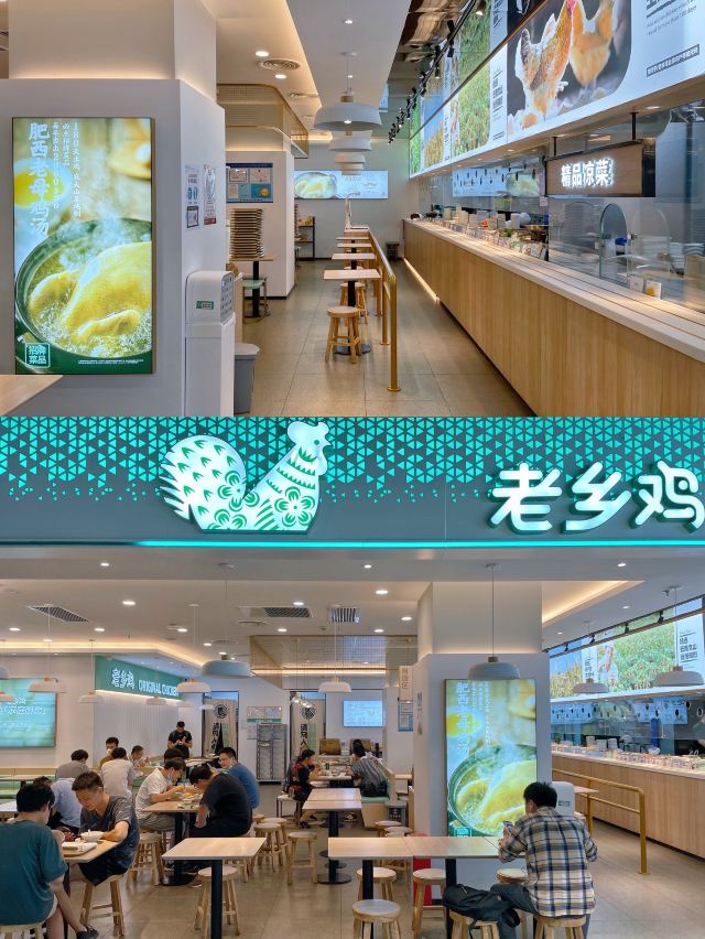 中式快餐巨头老乡鸡,白切鸡中的Tiffany,好吃不贵高性价比,每一家都开在热门商区,给打工人加油打气💪 正大乐城的地下美食宝藏,也是龙华中路打工人的集体食堂,饥肠辘辘的时候立马能吃上一口热饭热菜,瞬间get满满元气✔️ 销量大佬白切鸡几乎每桌必点✔️皮黄肉白的白切鸡鲜嫩爽滑,运气好的话还能活捉大鸡腿🍗本来清淡寡味的鸡肉,蘸上酱汁瞬间有滋有味。 搭配一盅原汁原味的肥西老母鸡汤,绝对是实力圈粉的王炸CP,表面一层鸡油封顶,顺势一捞还有大块鸡肉,胜过一切心灵鸡汤,喝什么饮料都不如它来得有营养。 全自助选购,所见即所得,荤素搭配营养均衡,每天上午11点和下午5点出餐最全。 竟然还有智能识别收银功能,把餐盘放上电子秤即可自动扫描计价,Amazing🤩 店里还有干净整洁的自助区,茶水🍵餐具🥢纸巾🧻调料🧂一应俱全,可以按需取用
