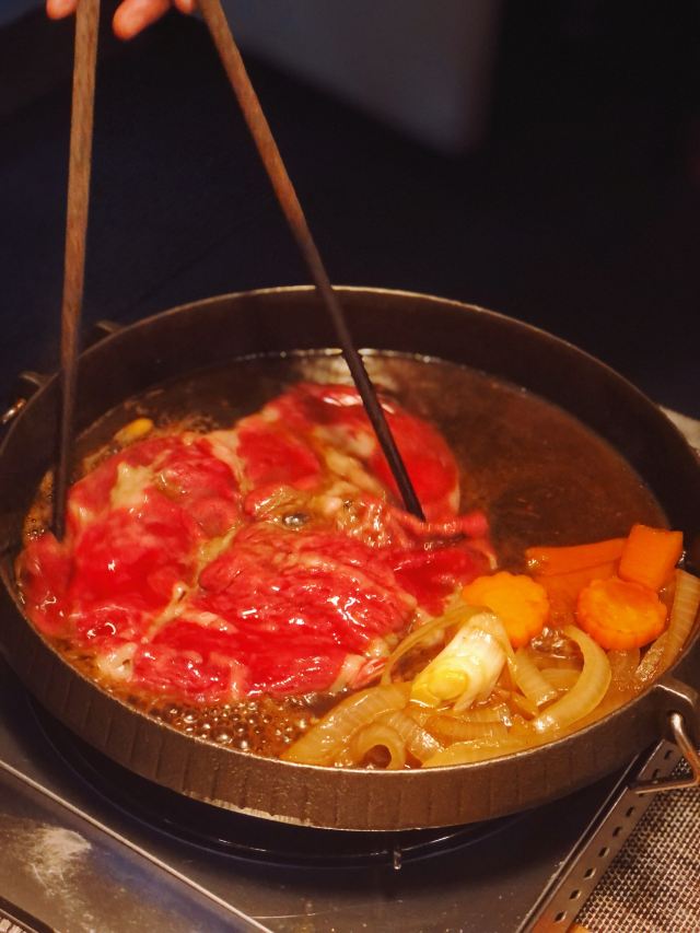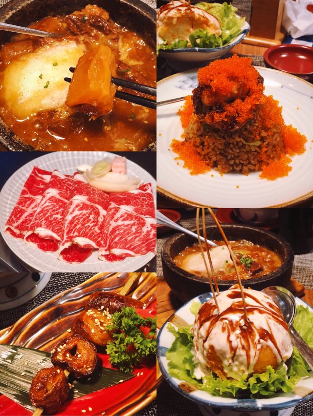 M6招牌关东寿喜烧,鹅肝炒饭,寿喜锅,芝士豆腐,温泉蛋土豆泥,鹅肝寿司,烤大肠,梅汁煮牛舌,石锅煮牛筋,烤青花鱼