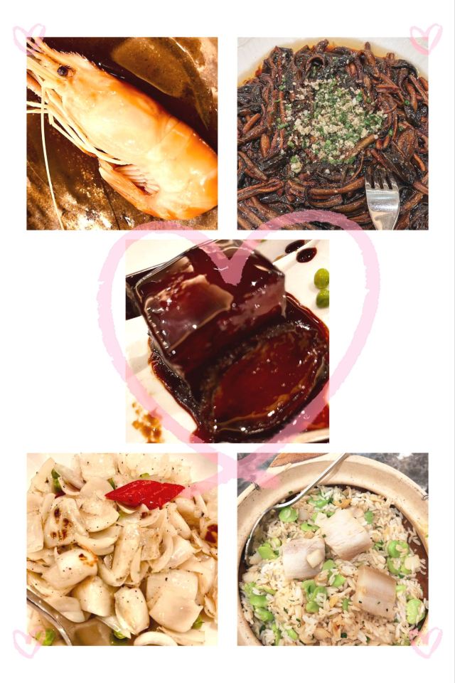本帮红烧肉,松仁野菜福包,脆皮鸡,松露炒百合,脆皮和牛糯米山药,鸡头米小豌豆,白斩鸡,上海熏鱼,文蛤豆腐,五福点心拼盘,牛油果春卷