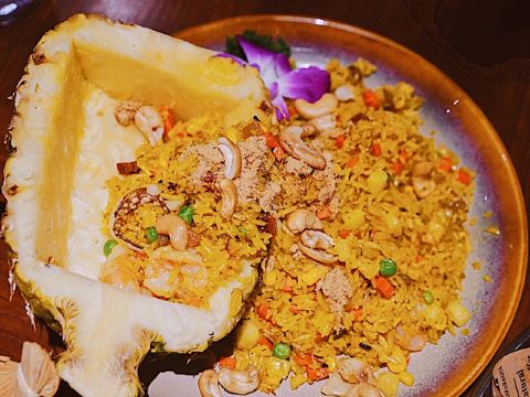 东阴功海鲜汤,芒果糯米饭,泰式炭烤猪颈肉,菠萝海鲜炒饭,虾片,泰式招牌咖喱皇炒青蟹,招牌青木瓜沙拉,马来咖喱牛腩,金钱虾饼,虾酱空心菜