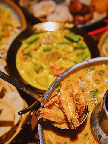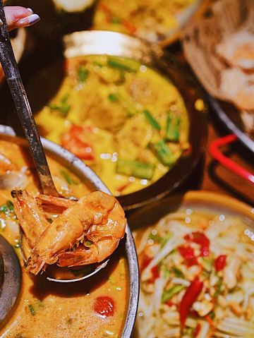 难得来夏都小镇玩一圈,还不吃顿好的犒劳一下自己?搜到这家纳兰宫•东南亚风味餐厅,莫非是夏都小镇上的泰皇宫❓异域风情的装修让你梦回萨瓦迪卡🇹🇭 午市用餐高峰人满为患,就连露天位都坐满了人。店里有独立包厢可以满足生日和纪念日等布置需求,让聚餐更有仪式感🎉 泰味十足的🍲冬阴功海鲜汤🍲,几乎每桌都能看见它的身影,每一锅都悉心熬制,泰国香料配上鲜活大虾,一上桌瞬间香气扑鼻,酸辣中带着一丝南姜味道,亲测一吃就会上瘾。 丰富多彩的🍤泰式小吃拼盘🍤,不用出国门也能打卡泰国人气一条gai,里面有虾饼、鱼饼、牛肉沙爹、鸡肉沙爹、泰式春卷、鱼露鸡翅、香脆虾片,用地地道道的风味小吃成全舌尖上的满足感。
